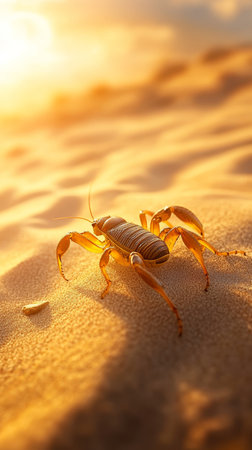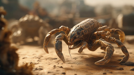 Scorpion on desert sand, soft diffused light, wide shot, realistic textures.
