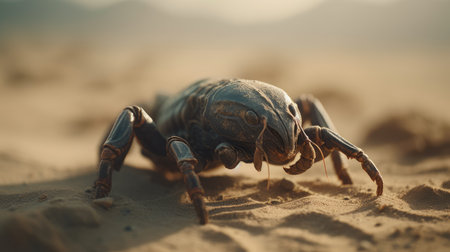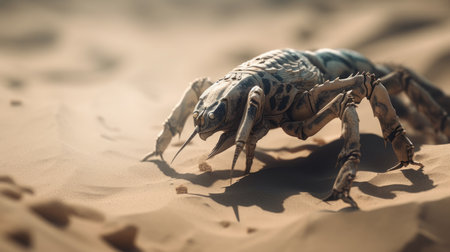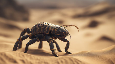 a dune bug perches on the sandy surface, illuminated with realistic chiaroscuro lighting. this national geographic photo by sandara tang captures the bug in a dynamic and expressive pose. the dark indigo and dark bronze tones add depth to the matte photo, resulting in a stunning uhd image. ai generated