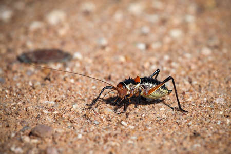 A vibrant grasshopper showcases bright colors as it rests on sandy terrain, revealing intricate details of its body and antennae against a softly blurred background.