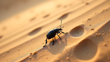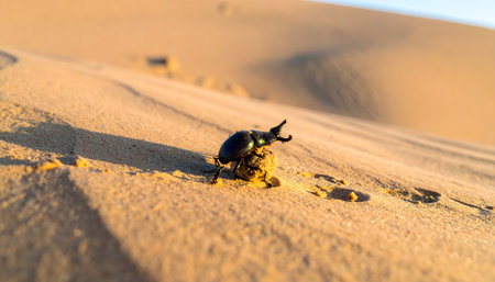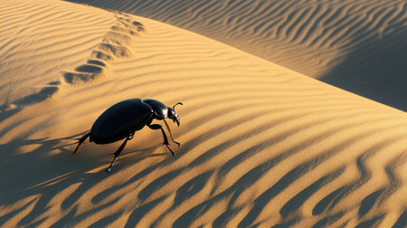 A stunning black beetle crawls across a backdrop of golden sand dunes, showcasing the beauty of nature under bright sunlight. The unique texture and patterns in the sand create a captivating scene of the desert environment.