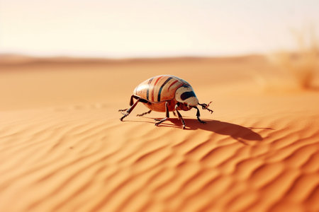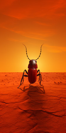 a red bug stands on the desert, bathed in the warm glow of a sunset. this surreal 3d landscape captures a humorous animal scene, showcasing the intensity of a heatwave. through macro photography, the image depicts trapped emotions, set against a hellish background reminiscent of saturno butto's style. ai generated