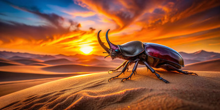 Extreme low-angle shot of a rhinoceros beetle or similar scarab beetle navigating a sand dune in a hot, arid landscape.