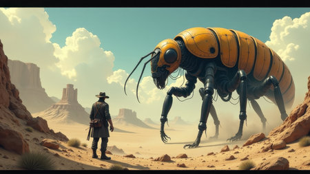 a brown grazing bug stands in the sand, showcasing a futuristic realism style. rendered in maya, the bug is depicted in light gray and gold tones. this captivating artwork by mike campau tells intricate stories through transfixing marine scenes and explosive wildlife. ai generated