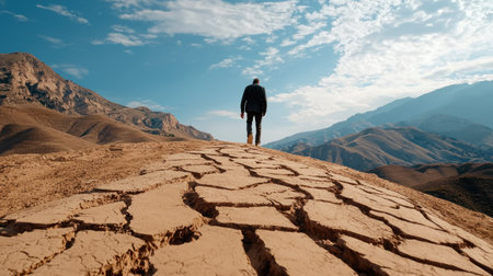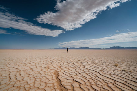 A solitary person is seen from behind, standing on a dry, cracked earth surface, looking out towards a distant horizon.