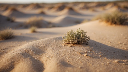 A serene desert scene featuring delicate wildflowers growing on sandy dunes, illuminated by soft sunset light, creating a tranquil atmosphere.