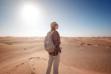 attractive asian young woman in plaid shirt in desert, treveling in UAE on safari, wearing hat and backpack, exploring nature of sandy beauty