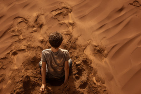 Serenity Found: A Boy Seating on Brown Sand --ar 3:2