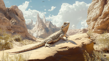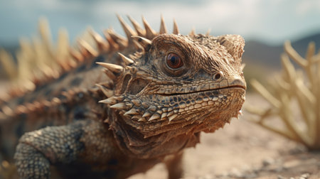 A spiky lizard stands on a sandy rock formation within a desert landscape scene Perfect for wildlife and nature content.