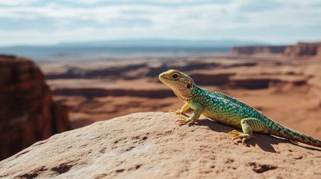 A vibrant lizard perches on a rock against a stunning desert backdrop, showcasing its colorful scales. The scene embodies tranquility and natural beauty.