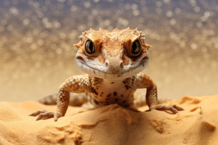cute gecko on the sandy background with copy space