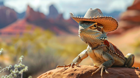A lizard wearing a cowboy hat sitting in the desert.
