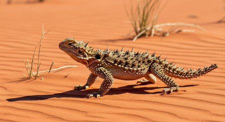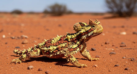 A detailed, low-angle photograph of the spiky, camouflaged lizard in its native, arid, red-orange desert environment.