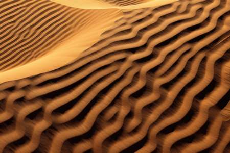 Texture showing rippled sand dunes with wavy lines and shadows in golden sunlight keywords: sand, dunes, desert, texture, pattern, wavy, lines,...