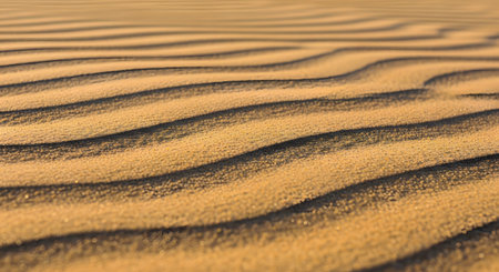 Close-up of sand dunes showing wavy patterns created by light and shadow Clear details and vibrant colors enha...