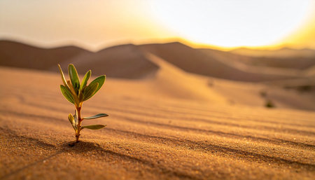 A solitary plant thrives in a dry desert landscape under a dramatic sunset, symbolizing resilience and survival in harsh environments. Perfect for nature themes.