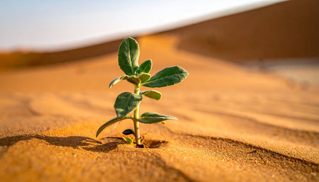 Wide shot of a single small plant growing in the middle of a desert, photorealistic, hyper-realistic, beautiful, in daylight, cinematic. --ar 8:3 --v 6.1 Job ID: 62331c4d-f6fd-4a36-a92a-b1f20179ddd3
