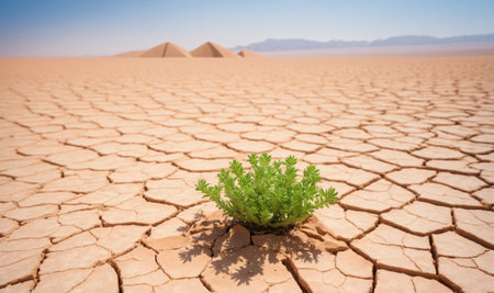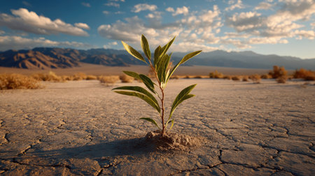A solitary young plant, showcasing vibrant green leaves, stands strong in a cracked, dry terrain. The image presents a clear daytime view with a vast, open landscape under a partly cloudy sky. The composition emphasizes resilience and growth, suitable for illustrating themes of environmentalism and natural resources.