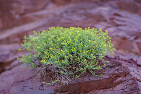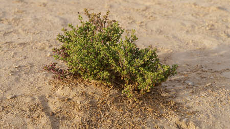 Halophyte Zygophyllum qatarense or Tetraena qatarense plant in desert of a qatar, Selective focus.