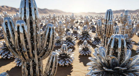 Futuristic metallic desert cacti at sunset: surreal landscape with shiny reflections.