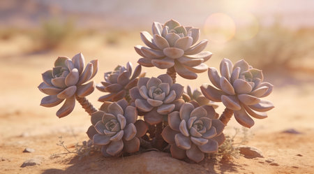 A creative digital illustration depicting Earthy sage succulent plant cluster blurred background, desert sun soft filter, arid botanical mood, professional digital art. This AI-generated artwork features unique visual elements suitable for various commercial and editorial applications. AI-generated illustration.