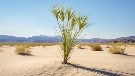 An AI generated illustration of a cluster of shrubs emerge from the golden sand of a desert setting, providing a striking contrast