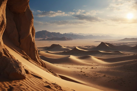 Stunning Desert Landscape at Golden Hour Featuring Curvy Dunes and Majestic Rocky Peaks Under Clouds
