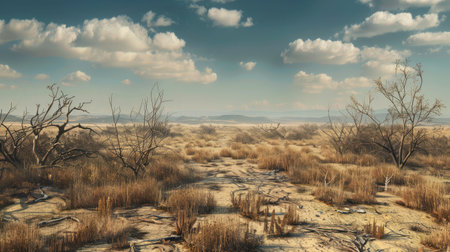 A drought-affected landscape with dead plants, leaving plenty of space for text or graphics.