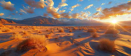 Expansive desert landscape showcasing golden grass amidst sandy terrain, with majestic mountains in the background and a bright sun illuminating the scene.