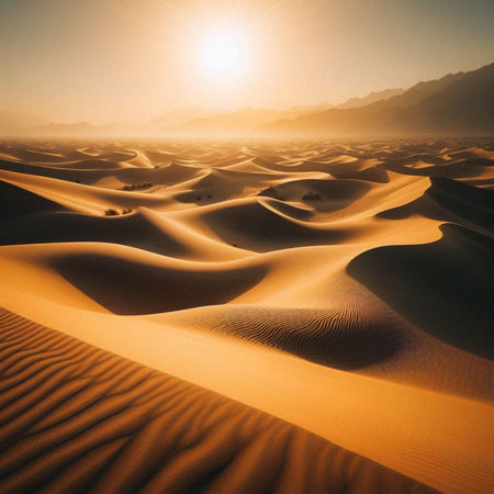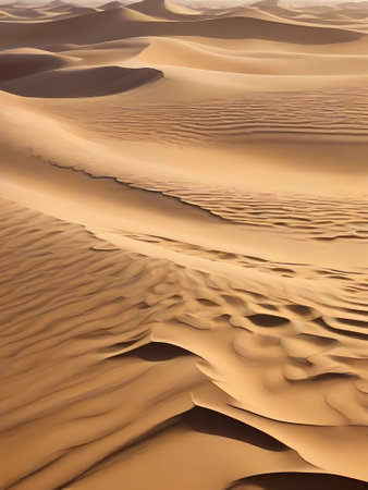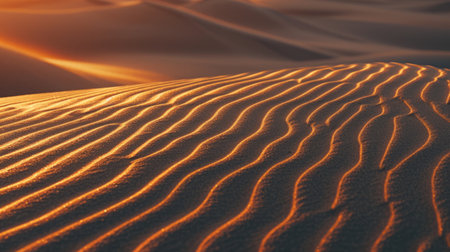 Warm sunlight illuminating rippled sand dunes stretching across a vast desert landscape, creating a mesmerizing natural pattern during a serene sunset