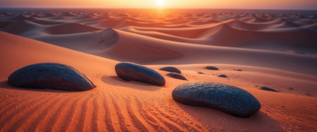 Expansive desert scene featuring undulating sand dunes and scattered smooth rocks illuminated by the warm glow of a setting sun. Tranquil and picturesque.
