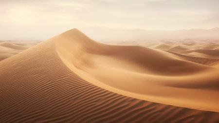 Rolling sand dunes with distinct ripple patterns stretch towards a pale, hazy sky, conveying a sense of vast, serene desert isolation.