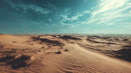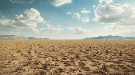 A vast, empty desert with a few sparse plants scattered throughout. The sky is clear and blue, with a few clouds in the distance. Scene is peaceful and serene, with the vastness of the desert