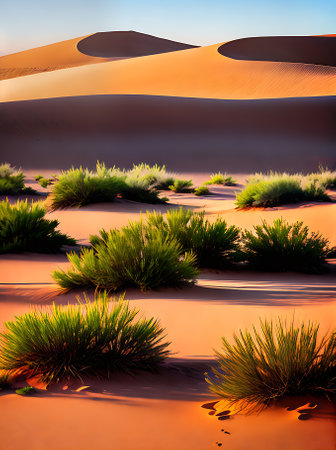 A serene desert landscape with rolling sand dunes and sparse trees. Created with Generative AI technology