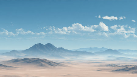 A vast desert stretches out with rolling sand dunes and distant mountains creating a serene backdrop. Fluffy white clouds float in a bright blue sky enhancing the landscape.