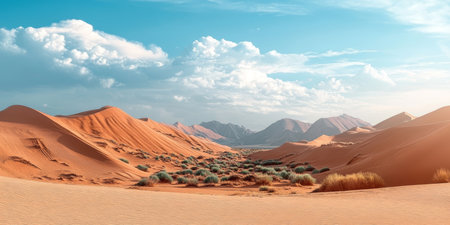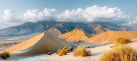 Explore this stunning desert landscape showcasing rolling sand dunes and majestic mountains under a vibrant blue sky filled with clouds.