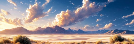 A breathtaking view of an expansive desert landscape featuring golden sand dunes beneath a bright blue sky filled with soft, white clouds, capturing the beauty of nature.