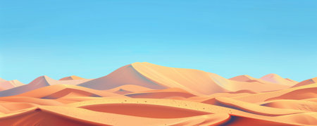 Waves of golden sand rise and fall across an expansive desert, glowing under a clear blue sky. The tranquil landscape invites a sense of calm and adventure, showcasing natures beauty.