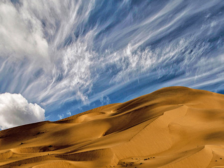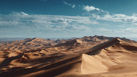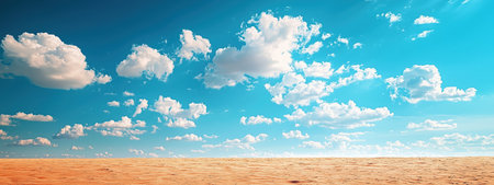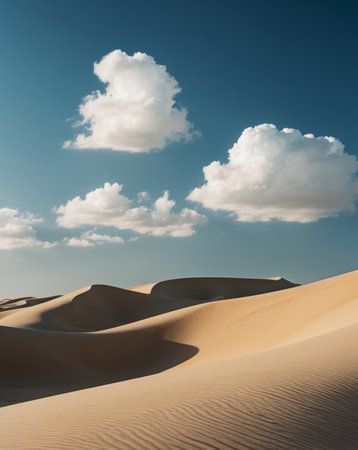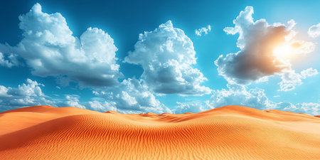 AI Generated. A clear image captures a blue sky with fluffy clouds above golden sand dunes in the foreground of a desert landscape