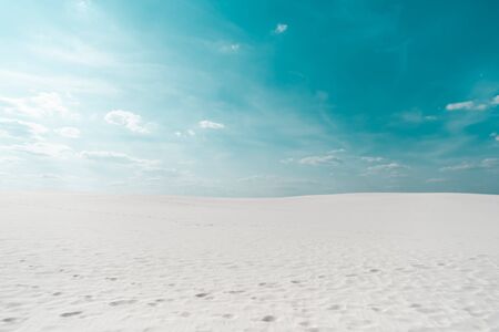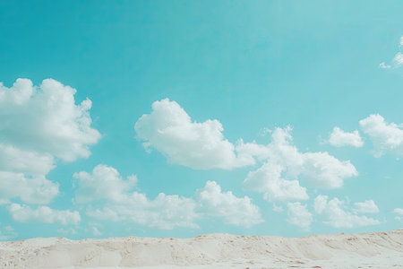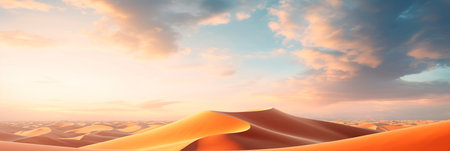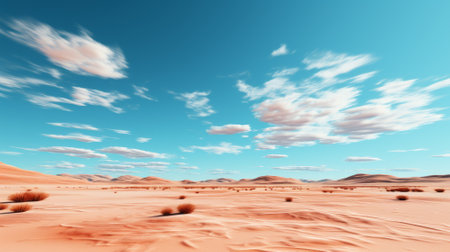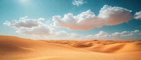An image of beautiful minimalistic desert landscape with blue sky and white cloud. An abstract picture of desert surrounded by mountain of sand or sand hill and blue sky. Panorama concept. AIG42.