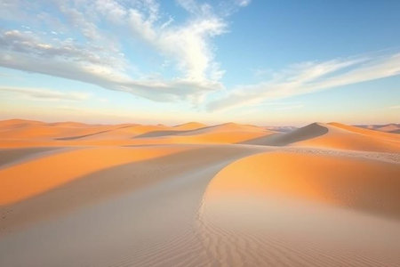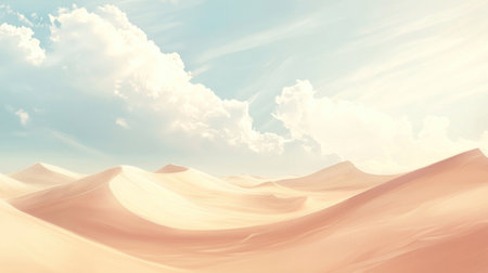 An expansive view of a tranquil desert scene featuring soft golden sand dunes under a clear blue sky adorned with fluffy white clouds, inviting peace and contemplation.