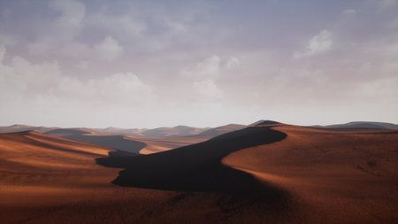 A stunning desert vista shows rolling sand dunes and shadowy valleys under a cloudy sky. The landscape features warm tones and hints of deep shadows that create a serene atmosphere.