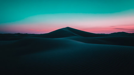 This breathtaking desert landscape captures rolling sand dunes and distant hills bathed in warm hues at sunset, creating a peaceful atmosphere ideal for relaxation.