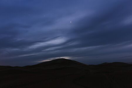 Lonely sand dunes under amazing evening sunset sky at drought desert landscape. Global warming concept