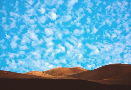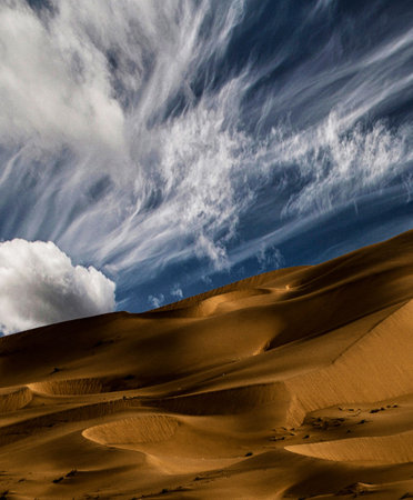 Beautiful gold sand dunes and dramatic sky with bright clouds in the Namib desert
