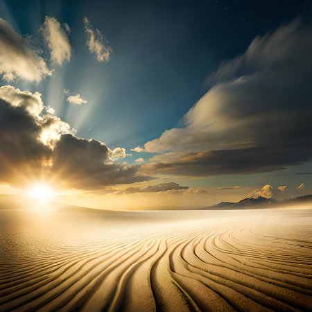 Breathtaking Desert Landscape Featuring Wavy Sand Dunes, Majestic Mountains, and Dramatic Sky