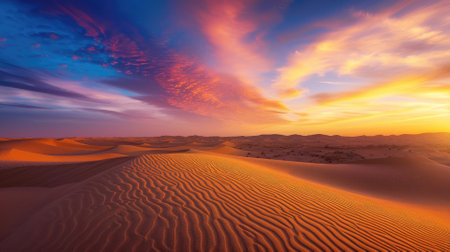 An expansive desert landscape at sunset, vivid colors in the sky, dunes creating patterns, portraying the beauty of wilderness. Resplendent.