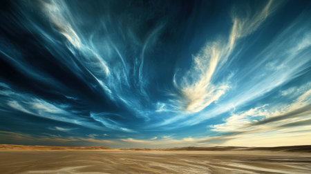 This captivating image showcases a stunning sky filled with dramatic cloud formations over a serene desert landscape, emphasizing the beauty of nature at dusk.
