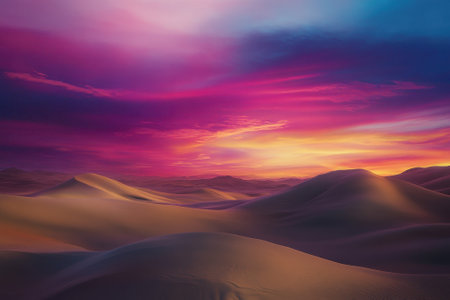 Breathtaking View of Majestic Sand Dunes in a Desert Landscape under a Colorful Sunset Sky