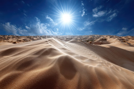 AI Generated. Vast desert landscape with sand dunes under a bright sun and clear blue sky