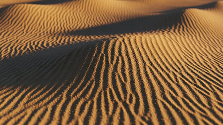 Close-up of rippled sand dunes in the golden hour, with sunlight casting dramatic shadows and highlighting the intricate natural patterns.